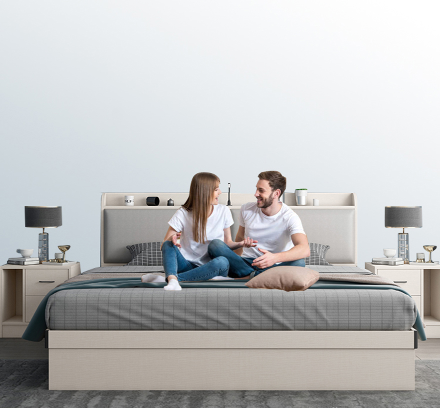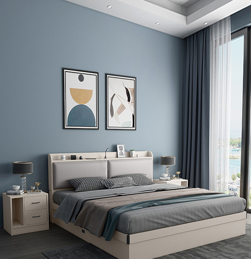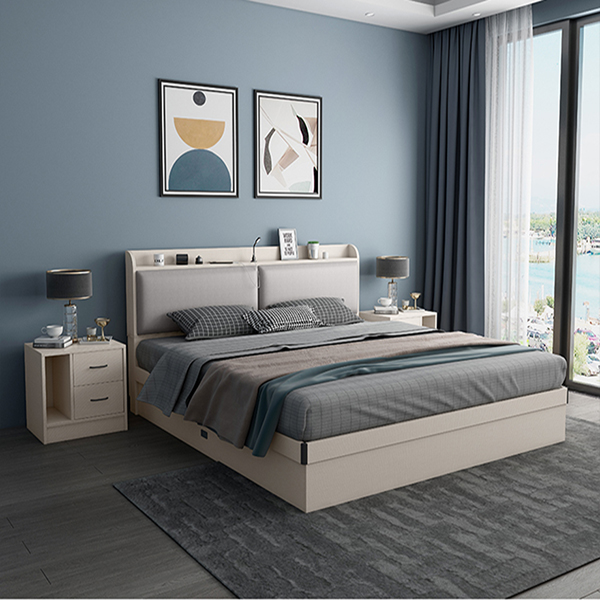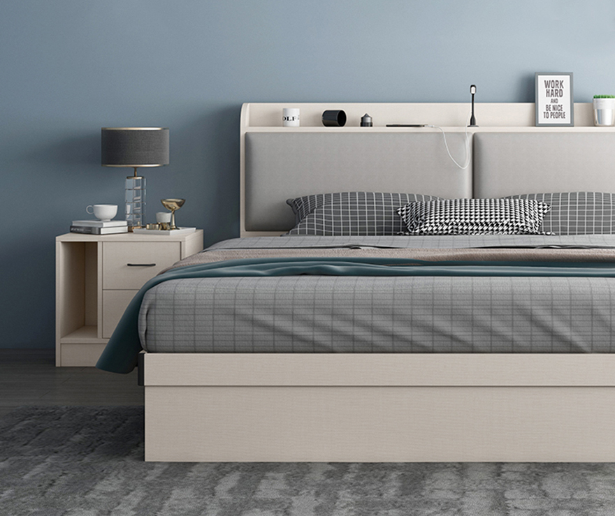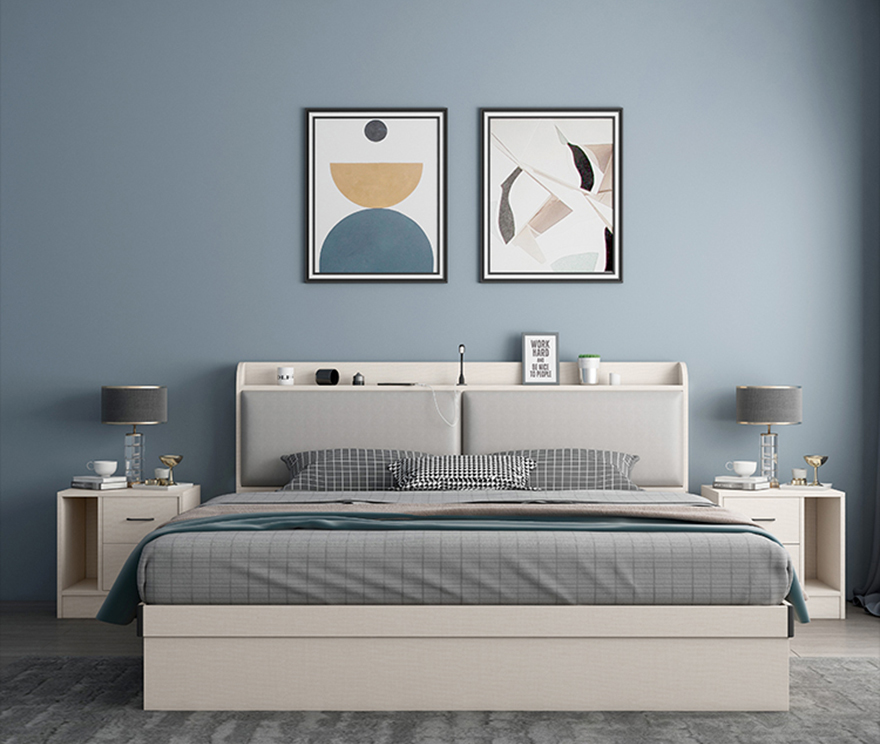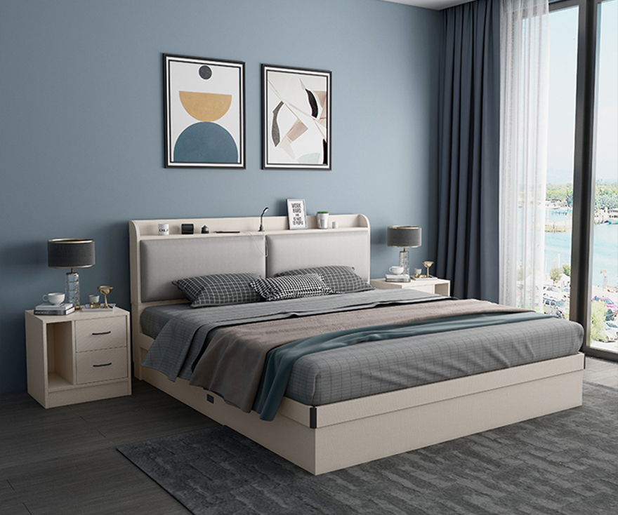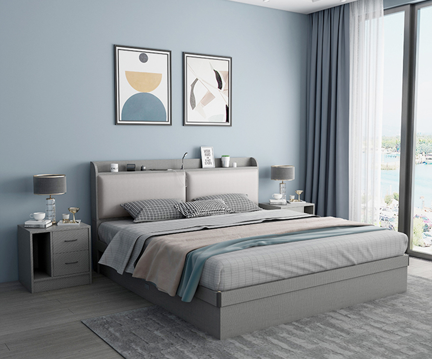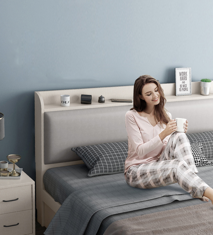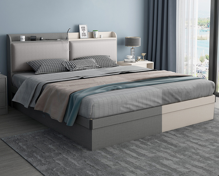 Giường ngủ hiện đại có phần đầu giường làm kệ để đồ và phần tựa lưng tiện lợi