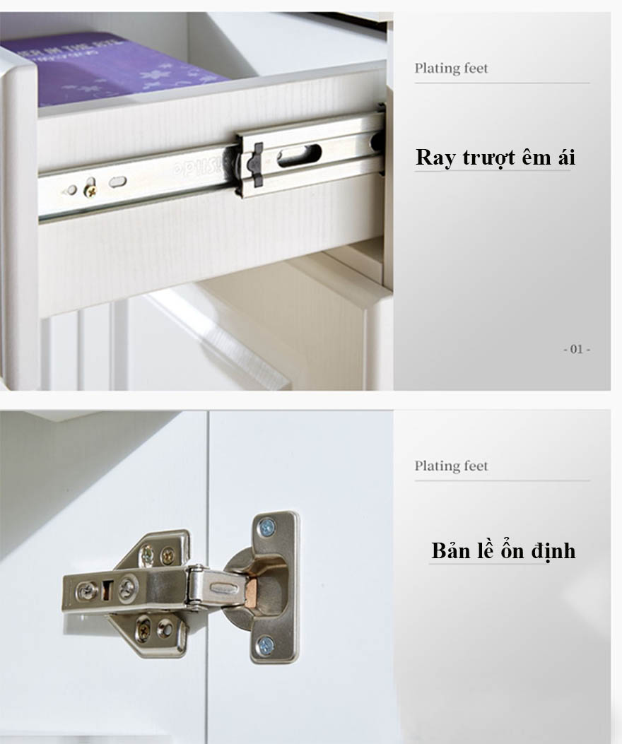 Mẫu tủ này có các chi tiết, đường nét thanh thoát, được thiết kế vô cùng tỉ mỉ, an toàn. Các phụ kiện như bản lề, thanh ray được làm bằng kim loại bền bỉ tăng độ bền sử dụng. Nếu bạn là người yêu thích sự đơn giản nhưng không hề nhạt nhòa thì mẫu tủ này là dàng cho bạn đấy. Bạn có thể lựa chọn màu sắc mà bạn yêu thích và phù hợp với không gian.